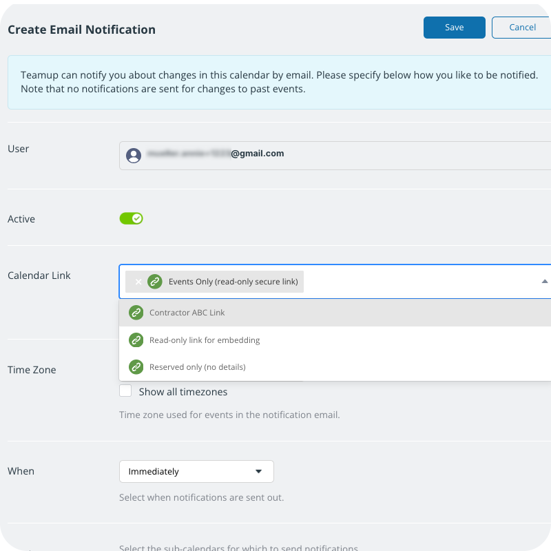 To keep your calendar secure, be sure to choose the appropriate link when you add new notifications for someone who does not have a Teamup account.